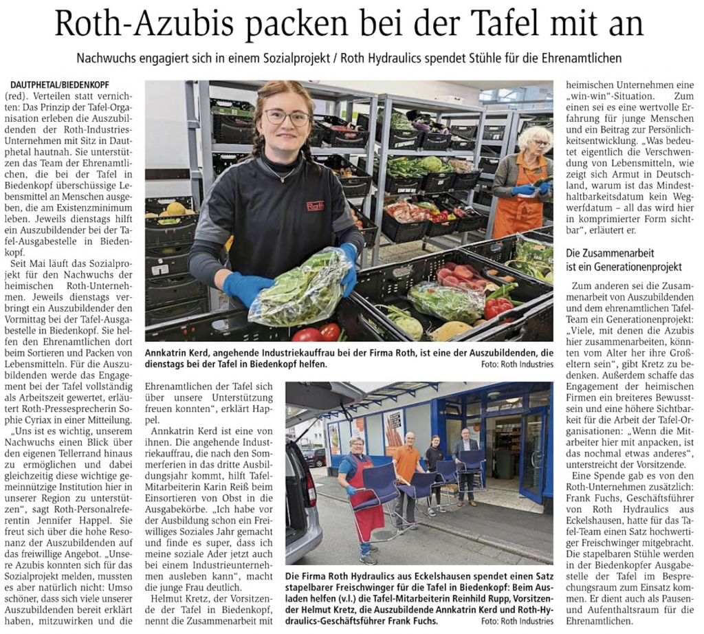 Seit Mai läuft das Sozialprojekt für den Nachwuchs der heimischen Roth-Unternehmen. Jeweils dienstags verbringt ein Auszubildender den Vormittag bei der Tafel-Ausgabestelle in Biedenkopf. Sie helfen den Ehrenamtlichen dort beim Sortieren und Packen von Lebensmitteln. Für die Auszubildenden werde das Engagement bei der Tafel vollständig als Arbeitszeit gewertet, erläutert Roth-Pressesprecherin Sophie Cyriax in einer Mitteilung. ,,Uns ist es wichtig, unserem Nachwuchs einen Blick über den eigenen Tellerrand hinaus zu ermöglichen und dabei gleichzeitig diese wichtige gemeinnützige Institution hier in unserer Region zu unterstützen“, sagt Roth-Personalreferentin Jennifer Happel. Sie freut sich über die hohe Resonanz der Auszubildenden auf das freiwillige Angebot. „Unsere Azubis konnten sich für das Sozialprojekt melden, mussten es aber natürlich nicht: Umso schöner, dass sich viele unserer Auszubildenden bereit erklärt haben, mitzuwirken und die Ehrenamtlichen der Tafel sich über unsere Unterstützung freuen konnten“, erklärt Happel.